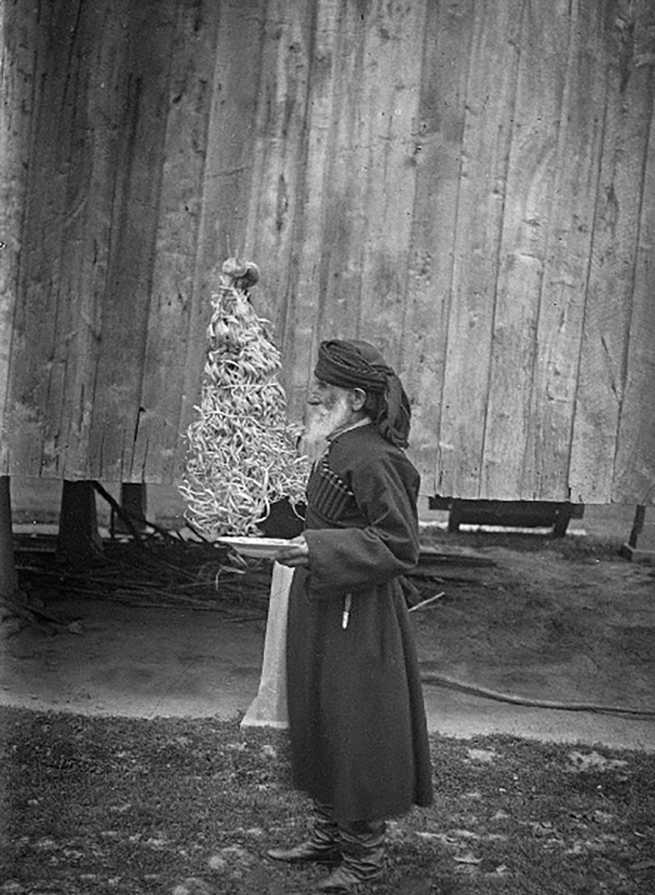 According to ethnographic descriptions, the mekvle would heat a stick of walnut wood over a fire at their home and whittle it so that the shavings would hang down from it in coils. Two wooden crosses would then be fixed horizontally onto the stick, one on the bottom and the other on the top. A braided wreath, decorated with ivy leaves, red hawthorn berries, holly, dark blue ivy berries, mistletoe branches, other evergreen plants and pomegranates, and topped with ritual bread—bokeli—was placed around the tree, as a symbol of fertility. (2) Apple-sized dough balls, called kvinchili would hang down from the dry ends of the wreath, along with thrushes, plucked of their feathers, with only tails and wings intact. (Sometimes only a bird’s tail was hung, as a reference to songbirds, known as siris kudi or “sparrow’s tail.”) These objects served as markers of the heavenly world and symbols of benevolent spiritual beings. Sometimes the tree would be decorated with silver coins, colorful ribbons, candies, and jewelry. According to traditional interpretations, this sacred tree, the Chichilaki, is the Georgian variety of the tree of life. (3) It was also called “Basil’s beard.”